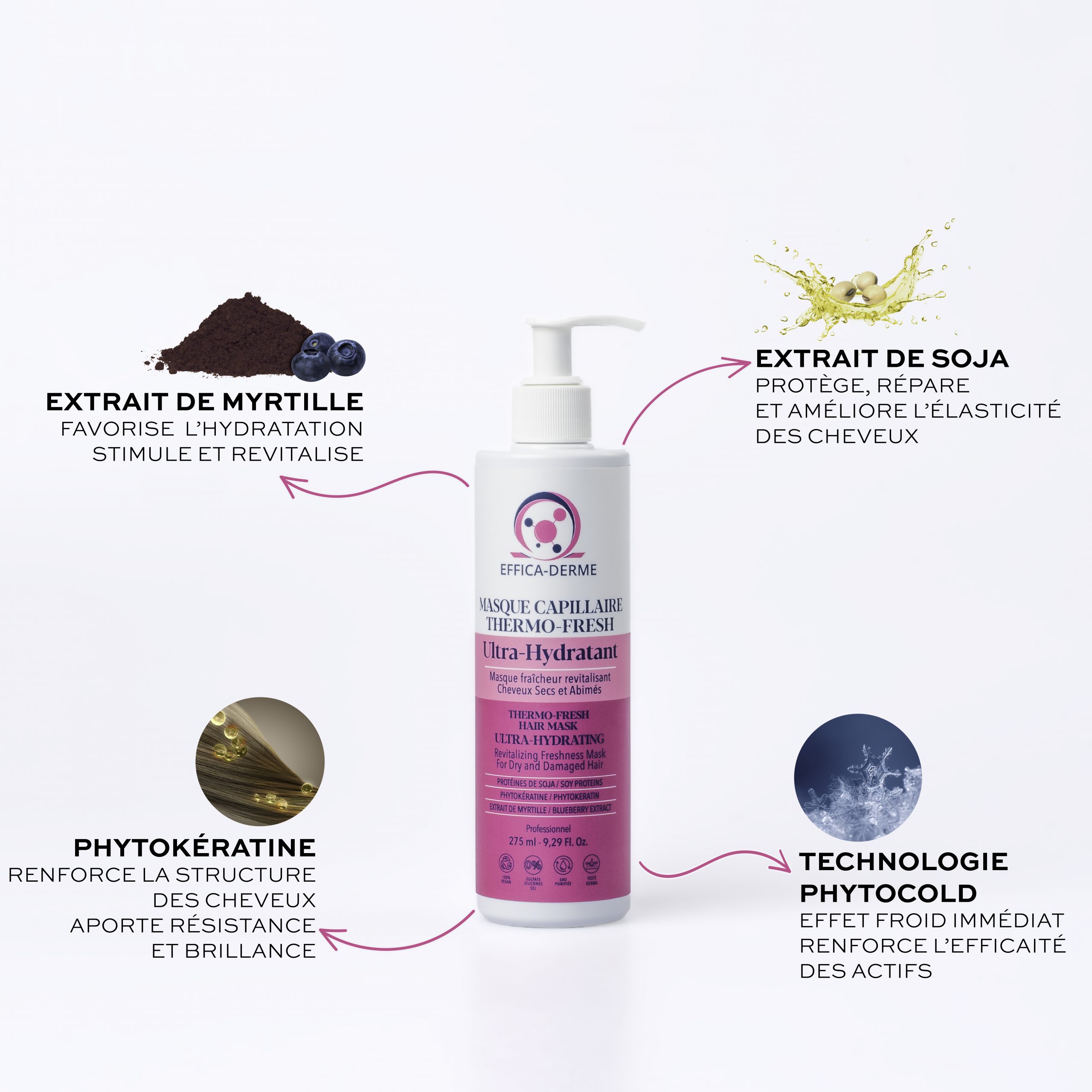 - Extrait de myrtille : Concentré en antioxydants, vitamines et acides aminés, il revitalise la fibre capillaire.