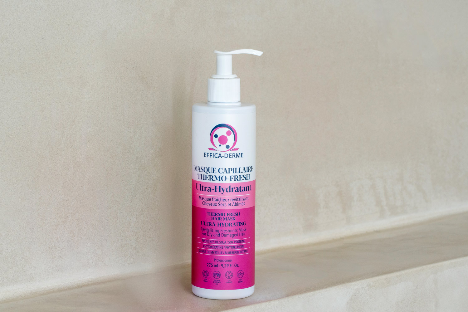 Le masque Thermo‑Fresh diffuse une sensation de fraîcheur immédiate qui stimule la fibre capillaire et optimise la pénétration des actifs hydratants.